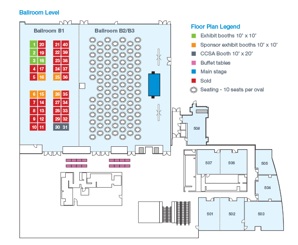 Please note: CCSA does its best to provide exhibitors one of their top booth choices in the exhibit hall. However, there are times when booth assignments need to be changed due to unforeseen circumstances. CCSA reserves the right to make changes to booth assignments and the exhibit hall configuration without notice. Thank you.