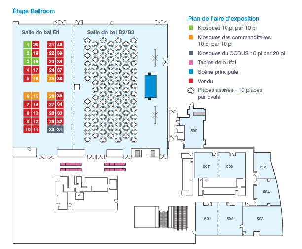 À noter que le CCDUS fait son possible pour offrir aux exposants l’un de leurs choix de kiosques dans l’aire d’exposition. Par contre, l’attribution des kiosques doit parfois être modifiée en raison de circonstances imprévues. Le CCDUS se réserve le droit de modifier l’attribution des kiosques et la configuration de l’aire d’exposition sans préavis. Merci